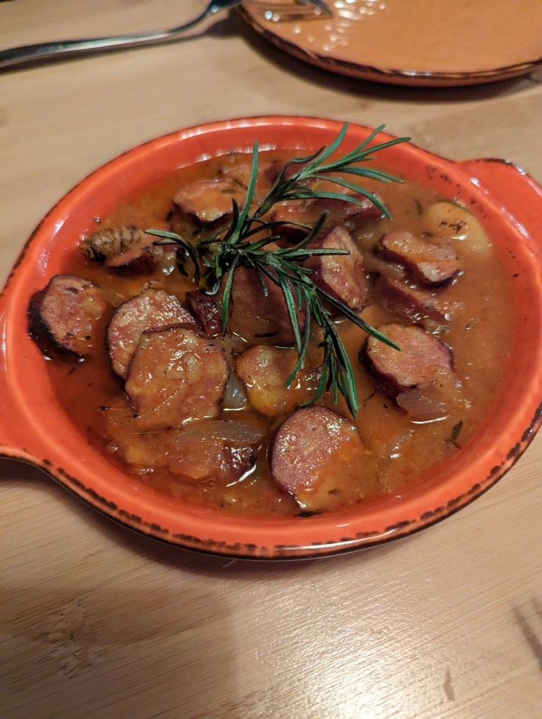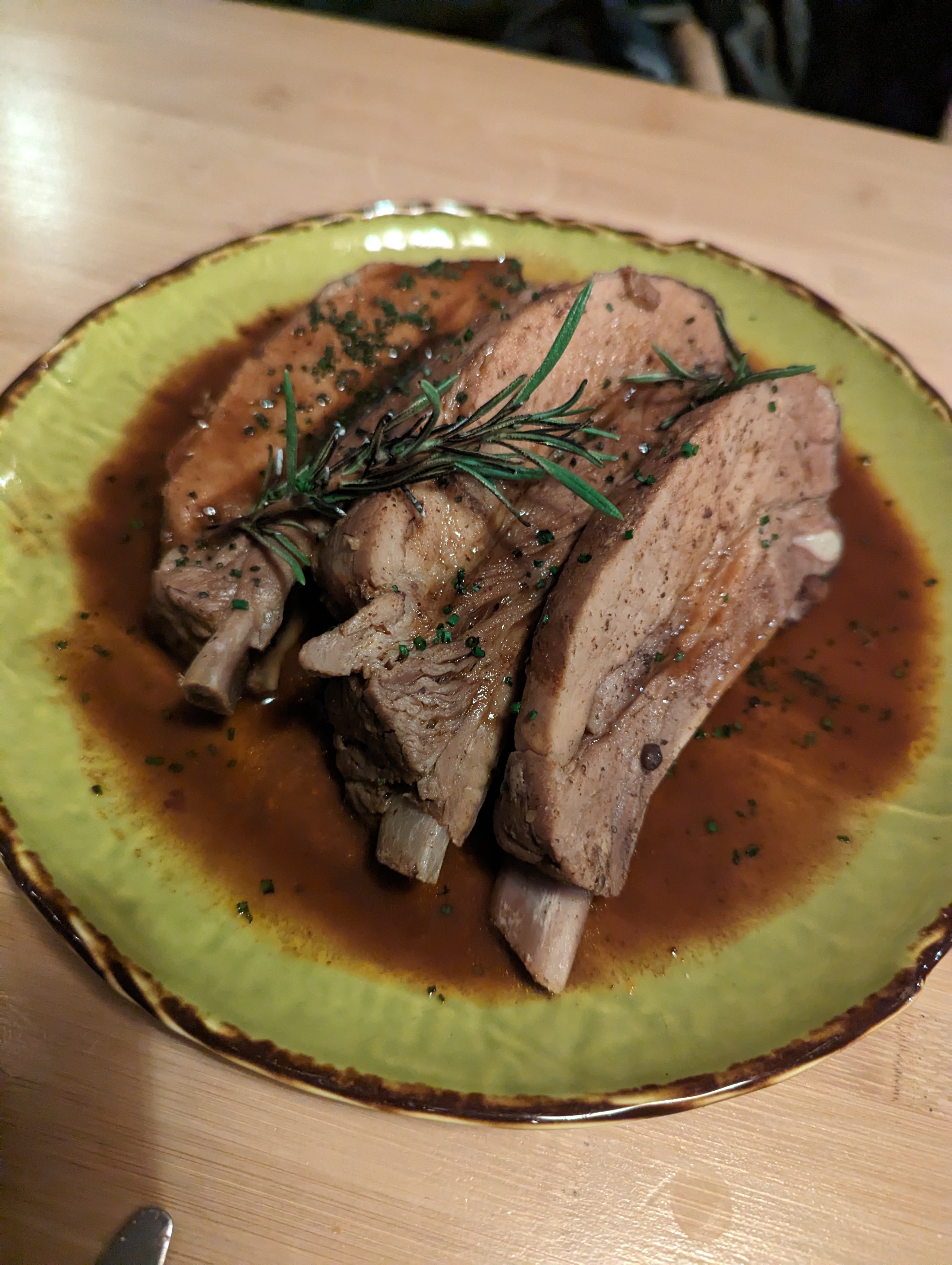 Le potjeevletsch est un plat traditionnel du Nord de la France, une sorte de pot-au-feu en gelée, que l’on sert froid. Idéal pour un buffet, n’est-ce pas ? Nous avons exploré le web, et sommes tombés sur cette recette. Ceci dit, nous n’avons pas osé faire le coup des feuilles de gélatine entières dans le plat (d’autant plus que nous le faisions dans une très grande terrine à baeckeofe). Nous avons donc fait fondre la gélatine (4 feuilles, une de plus qu’indiqué dans la recette) dans le bouillon avant d’en napper la viande. Et 3 heures plus tard, catastrophe : rien n’était pris. Après réflexion, nous avons récupéré le liquide (très liquide…), nous y avons incorporé un sachet de gélatine en poudre plus une feuille de gélatine, fait bouillir le tout un petit moment, nappé à nouveau la viande et mis au frais. Pendant que cela prenait (ou pas…), nous avons décidé qu’en cas de ratage, nous en ferions une salade (avec force oignons crus et cornichons). Mais cette fois, ça a pris, alléluia ! Et c’était excellent :