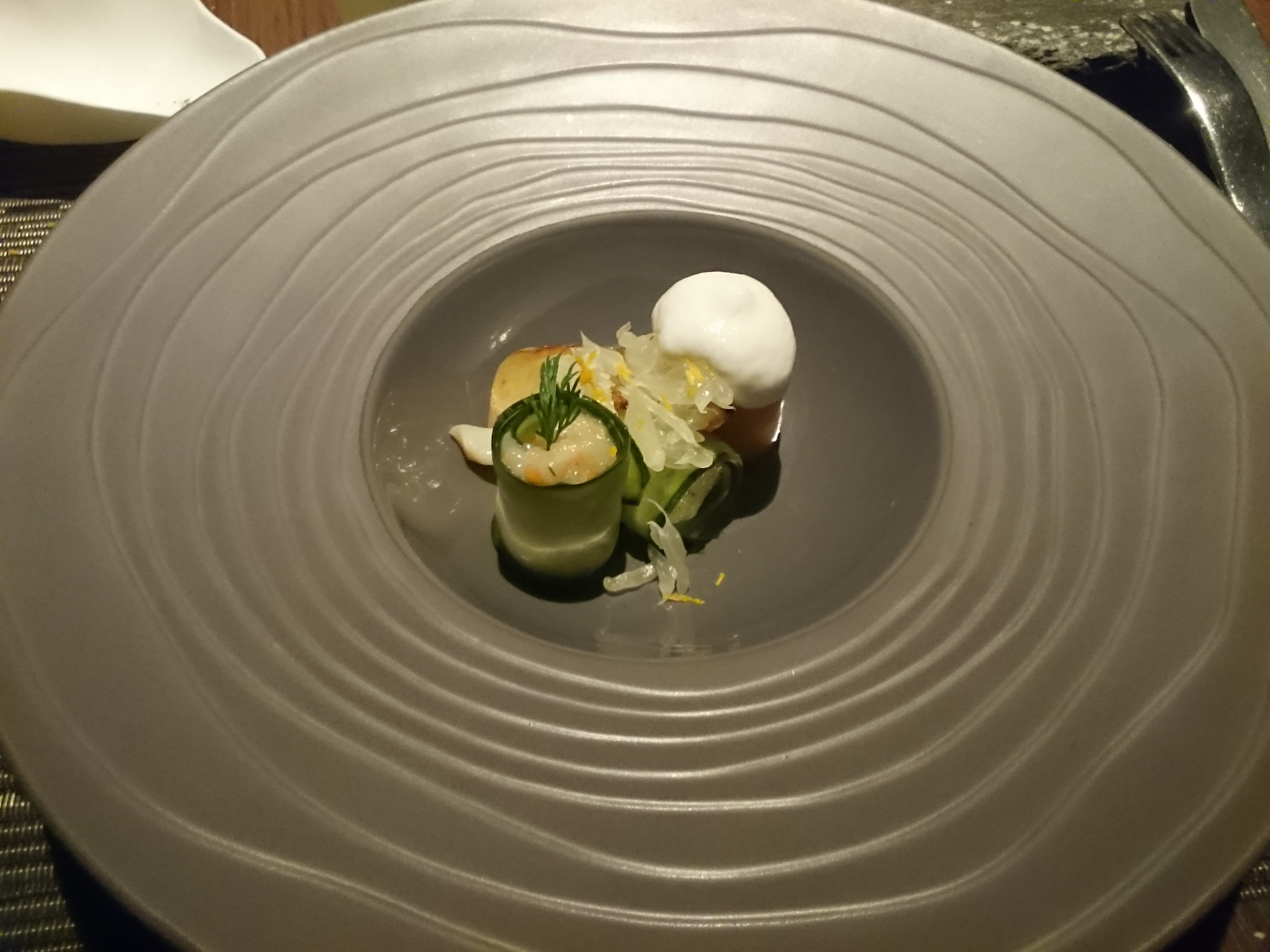 Ensuite Langoustine, couteaux, fenouil, orange, raviole végétale infusion Kaffir lime, un plat fusion très bien maîtrisé :