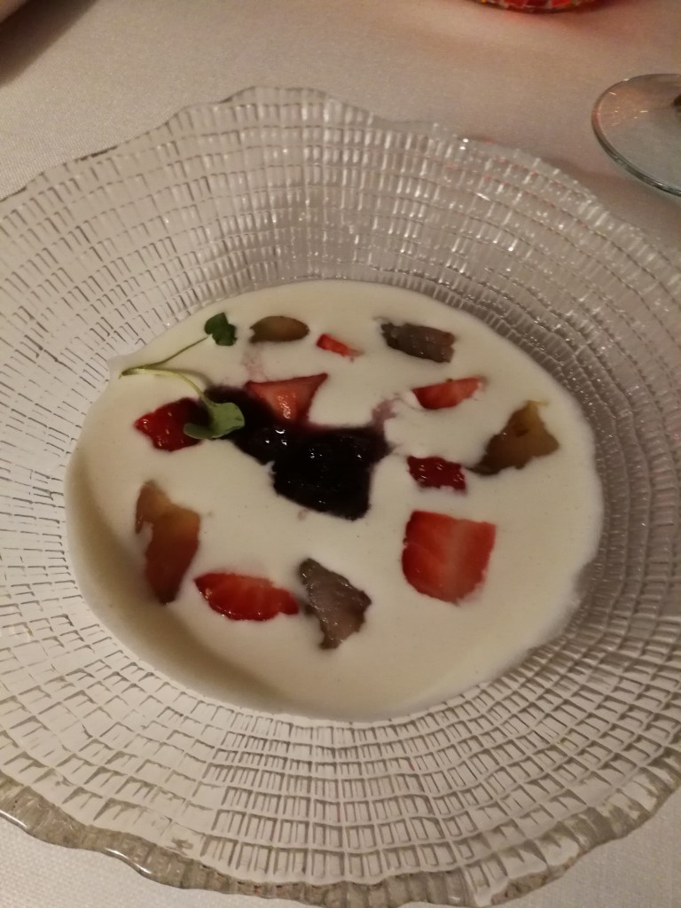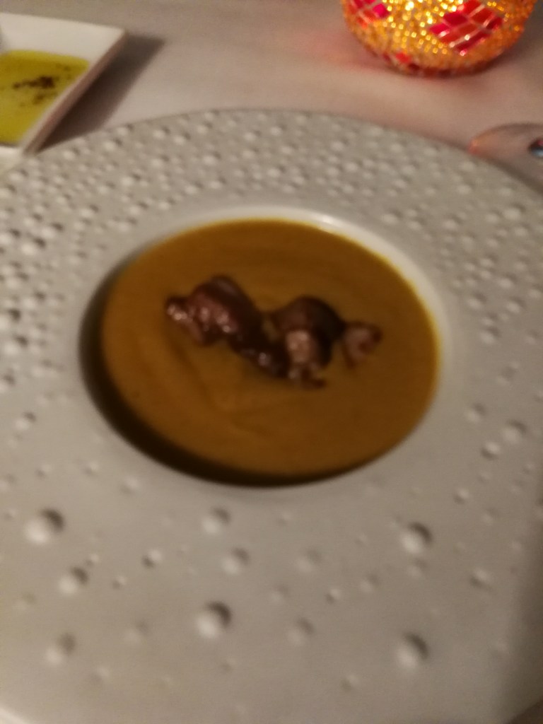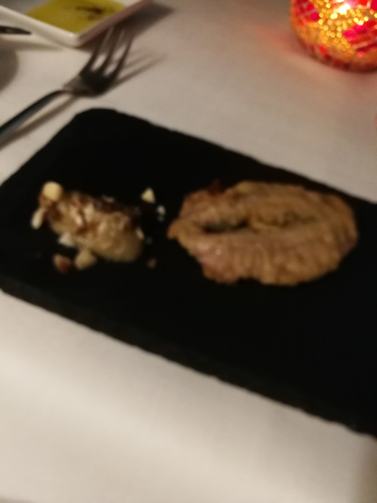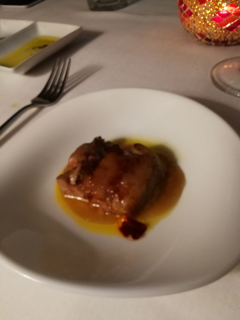 Samedi soir, nous avons fait un très bon repas au restaurant Arrayàn à Madrid, mais qui nous a laissé une impression un peu mitigée. En effet, nous avons été placés non pas dans la salle « normale », mais dans une petite salle séparée de l’entrée par des rideaux semi-fermés, où nous étions seuls, et comme l’a très bien résumé mon homme, nous ne savions pas si c’était une punition ou un honneur, mais en tout cas c’était, de notre point de vue, peu agréable – on vient aussi au restaurant pour une sorte d' »expérience sociale » après tout. Je dois dire que le service a très bien suivi, nous ne nous sommes jamais sentis abandonnés. Le chef, très sympathique, est venu nous parler plusieurs fois. Le fait qu’il s’agit d’un menu dégustation unique, sans choix possible (ce qui en soi ne me dérange absolument pas) n’a jamais été explicité. Le repas lui-même fut très bon, moins bon et moins recherché à mon avis que chez Etimo la veille, mais très bon, à l’exception des petites escalopes de foie gras servies beaucoup trop tièdes et donc écœurantes. J’ai aussi trouvé que tout cela manquait cruellement de légumes (ce qui n’était pas le cas la veille). Enfin, le service était gentil, mais je pense qu’il manquait quelqu’un du niveau « maître d’hôtel », les plats étaient présentés très sommairement et surtout, le vin (que nous avons pris au verre) était servi sans faire goûter (même à l’ouverture de la bouteille !) et sans le présenter (nous avons dû à chaque fois demander de quel vin il s’agissait).