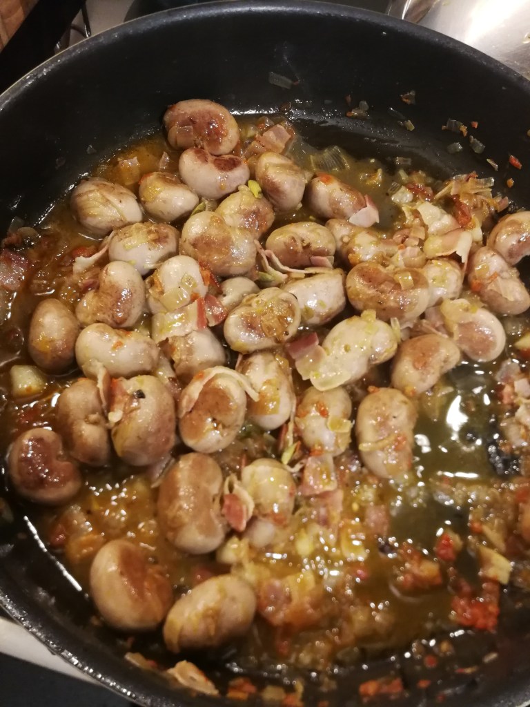 Lundi soir, j’ai pioché dans le congélateur et le frigo pour faire une improvisation : rognons de lapin aux échalotes, déglacés au cognac, avec un peu de sauge et de purée de tomates confites, le tout accompagné de purée de haricots verts.