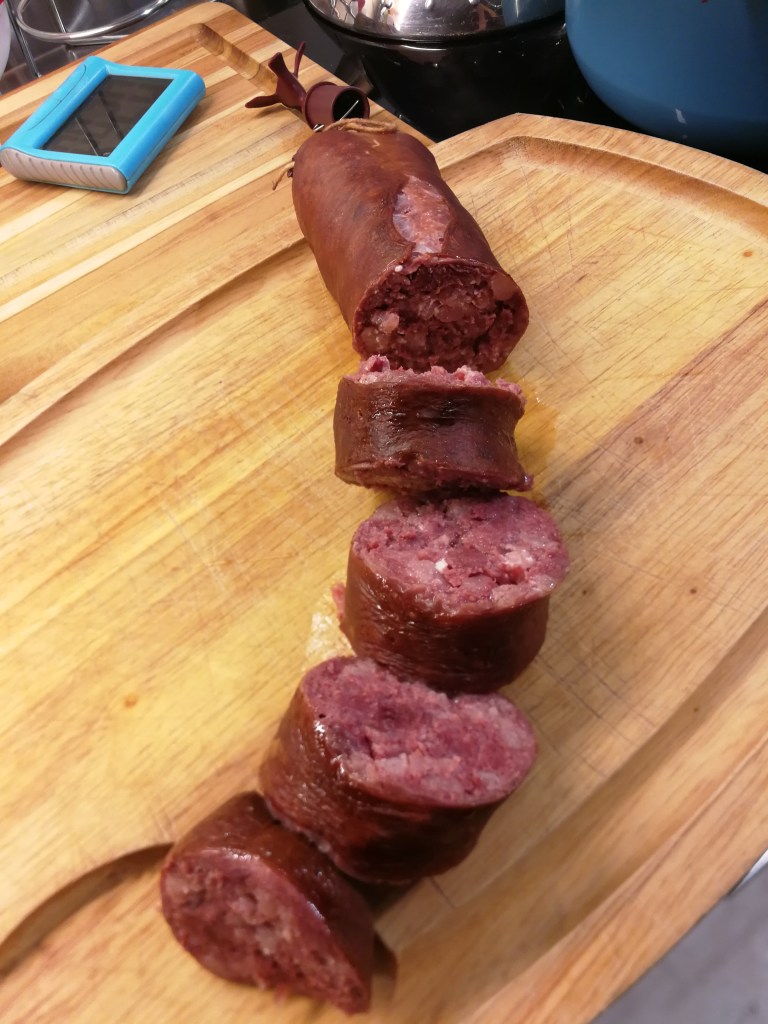 Mercredi soir, j’ai cuit un saucisson (type saucisson vaudois) de sanglier et l’ai servi avec une purée de pois cassés assaisonnée à l’ail en poudre et au paprika fumé – miam !