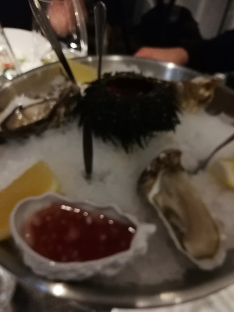 Jeudi soir, nous sommes allés à la Brasserie du Royal avec des amis. C’est toujours un endroit hautement recommandable. J’ai commencé par trois huîtres et un oursin, et poursuivi par une de leurs pièces de viande rassise, une araignée de veau délectable (désolée pour les photos pourries, il faisait assez sombre).