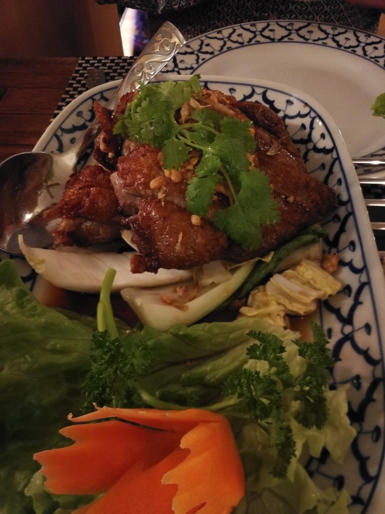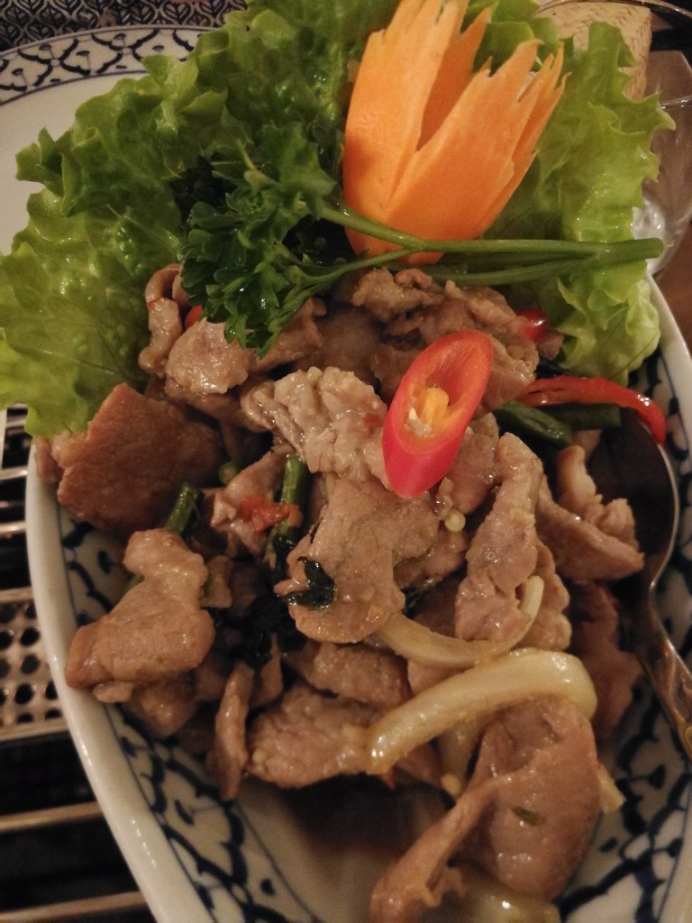 Vendredi soir, spectacle à nouveau, mais un peu plus tard (20h30), ce qui nous a permis de manger tranquillement à la Maison Thaï. Nous avons partagé une salade de boeuf en entrée, puis un canard croustillant aux légumes et un porc pimenté au basilic, le tout très bon, comme toujours.
