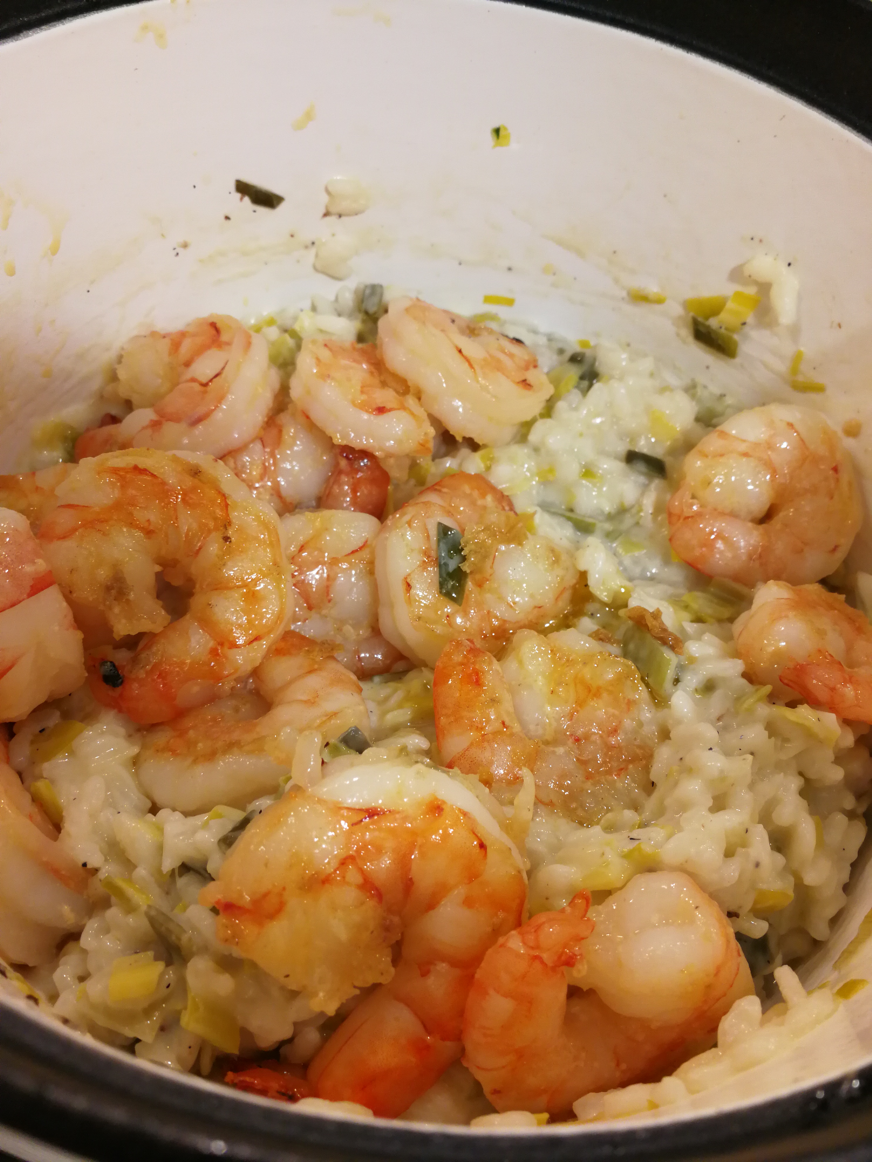 Jeudi soir, j’ai mitonné un risotto au poireau et aux crevettes (avec le traditionnel oignon du début remplacé par du poireau, du bouillon de poisson, la mantecatura faite au fromage frais type Philadelphia, et des crevettes poêlées pour le couronner).