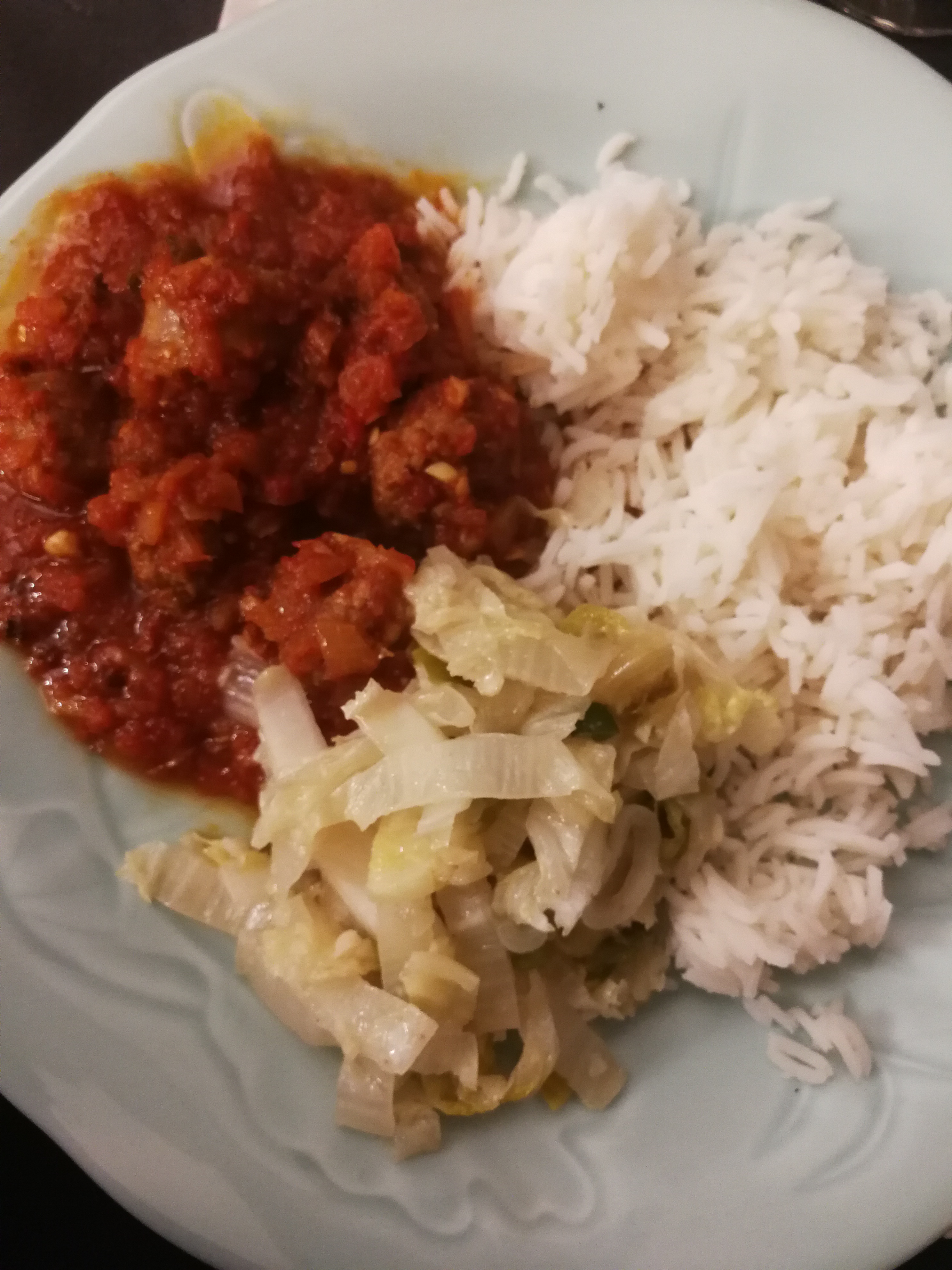 Mardi soir, j’avais prévu un rougaille saucisse pour nous deux, qui s’est étendu de manière impromptue à quatre (j’avais bien assez de saucisse, j’essaie d’utiliser le contenu de mon congélateur, ça tombait bien). Je l’ai servi avec du riz blanc et des brèdes. J’adore la cuisine créole, et je trouve qu’elle s’accorde paradoxalement très bien avec un temps bien froid – tout ce piment, ça réchauffe !