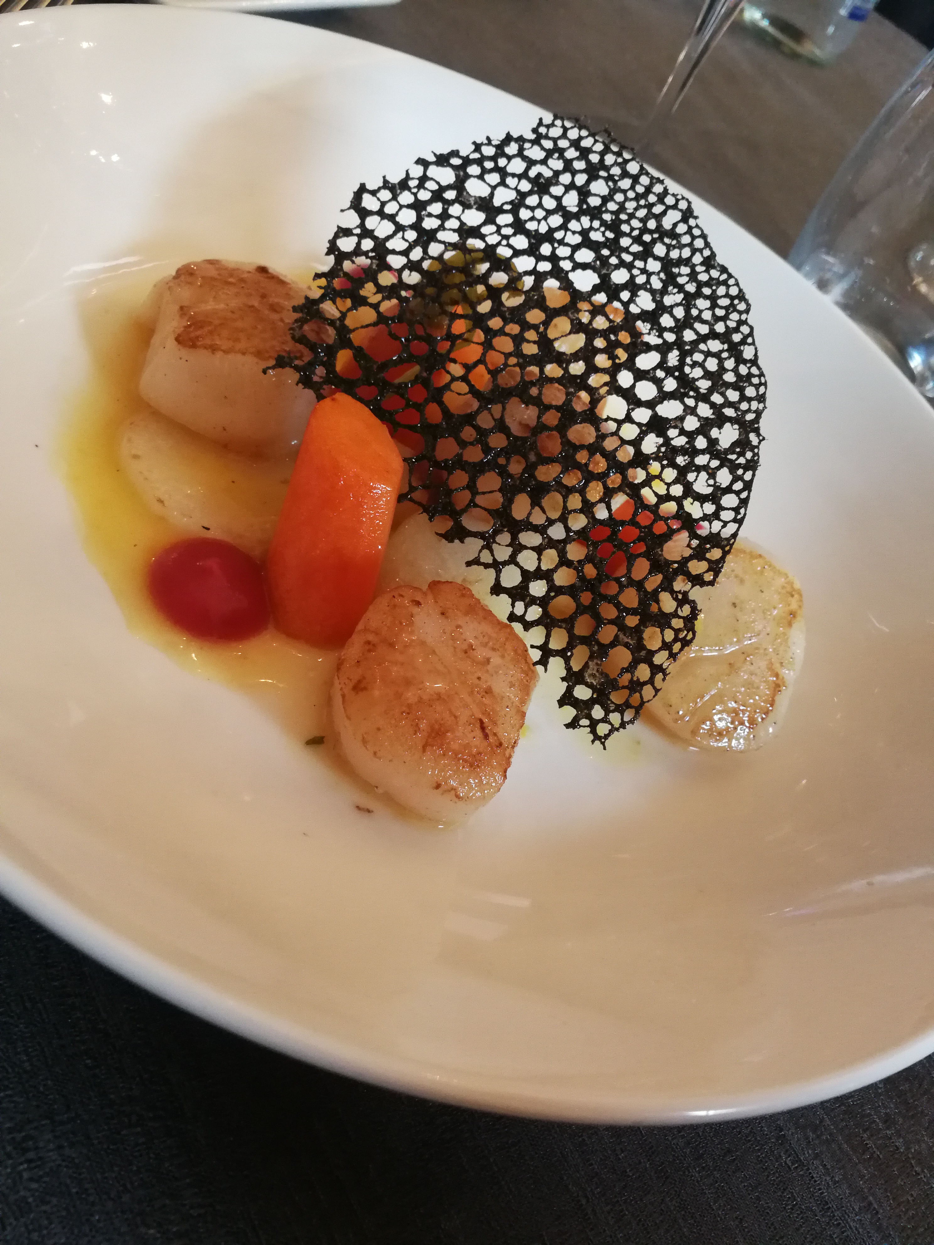 • Deuxième entrée : coquille saint-jacques sur lit de crème de pomme de terre, avec un Sauvignon Lafoa du Frioul.