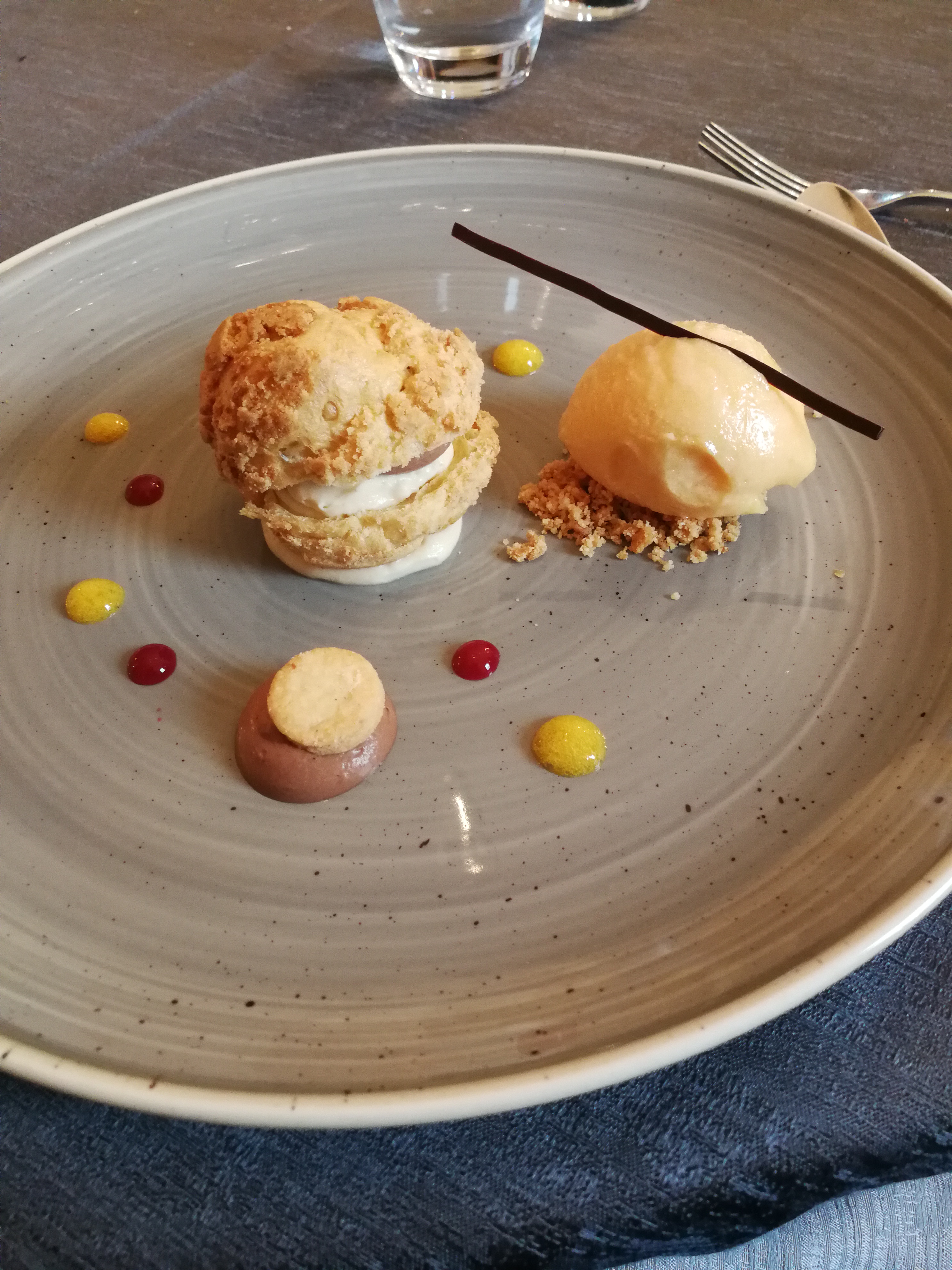 Mardi soir, nous devions aller chercher un de nos fils à l’aéroport de Genève assez tard, nous en avons profité pour essayer le Café de Peney. L’endroit est très agréable, un bistrot à l’ancienne bien décoré. Accueil et service charmants. En entrée, j’ai choisi le « Carpaccio de tête de veau, croquant de légumes, ravigote tiède de petits pois au wasabi » qui était franchement fantastique, moelleux et plein de goût, avec une salade très fraîche qui lui apportait du croquant en contraste. En plat, j’ai pris le « Pluma ibérique snacké, jus aux tomates et olives, churros de pommes de terre ». Là aussi, une réussite totale, viande moelleuse à l’extérieur croustillant, accompagné d’une sauce puissante qui lui seyait très bien, avec la touche fun des « churros » de pommes de terre. En dessert, nous nous sommes partagé une portion somptueuse du dessert du jour, un Saint-Honoré vraiment exceptionnel, crémeux et caramélisé à souhait :