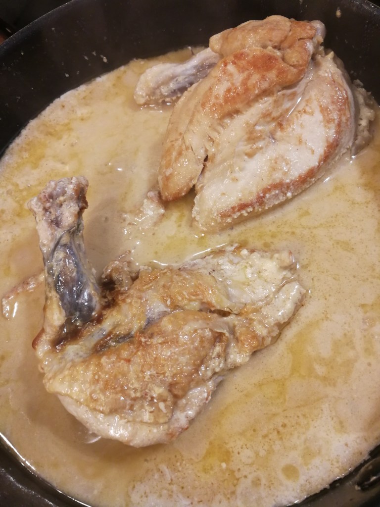 Jeudi soir, j’ai fait de la cuisine française bien classique : des suprêmes de pintade à la moutarde et à la crème (sans recette) avec des lamelles de pommes de terre au four (à la graisse de canard) et une salade verte.
