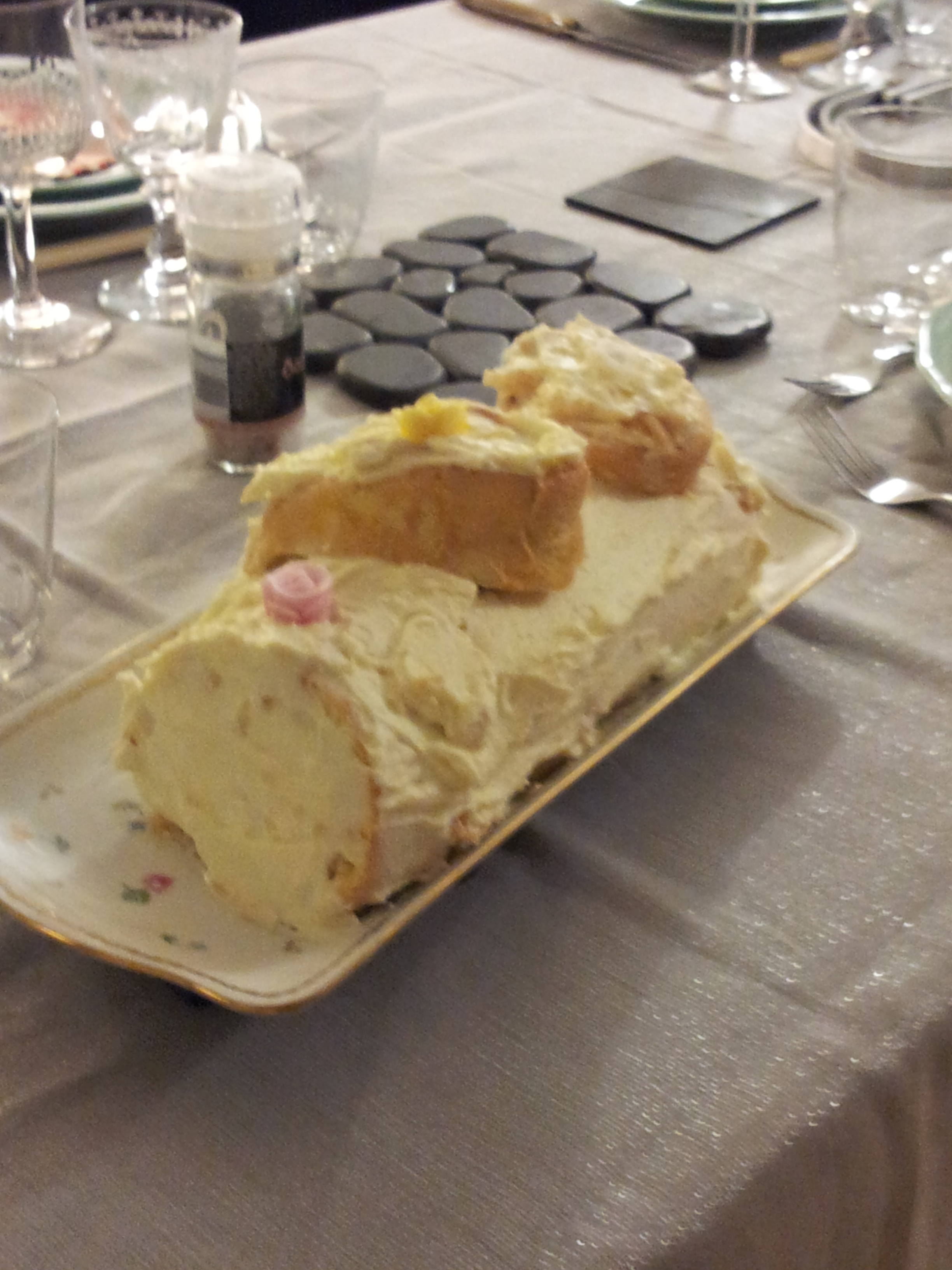 Dessert : délice au chocolat et framboises, ganache chocolat. Vin : Barolo Chinato. C’était pour moi une double surprise : premièrement parce que je ne suis pas très desserts, et encore moins desserts au chocolat, les trouvant souvent trop lourds et sucrés en fin de repas, mais là j’ai été conquise, la framboise relevait bien l’exquis fondant. Ensuite parce que j’avais entendu parler du Barolo Chinato, qui est un vin fortifié aux herbes et en particulier à la quinine, et je pensais que ce serait amer et que donc mon horreur de l’amer (j’ai une sensibilité exacerbée à l’amertume qui a paraît-il une composante génétique) m’empêcherait de l’apprécier, mais non, pas du tout, aucune amertume, tout au plus une légère âpreté, et une fraîcheur en bouche qui le mariait parfaitement au chocolat.