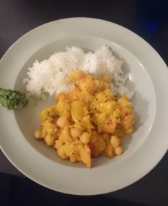 Dimanche soir, j’ai fait un grand classique italien, à savoir poulpe et pommes de terre. J’avais un énorme poulpe congelé (2,2kg quand même !), et en cherchant si on pouvait le cuire congelé ou s’il fallait le décongeler auparavant (la bonne réponse est la seconde), j’ai découvert une manière de le cuisiner que je ne connaissais pas : au lieu de le plonger dans une casserole d’eau chaude, il faut simplement le mettre, sans liquide, avec juste un peu de laurier, dans une casserole à couvert, et chauffer. Et comme il rend de l’eau, au bout d’une demi-heure le poulpe nage déjà dans une quantité respectable de liquide rouge. Il a fallu environ trois quarts d’heure en tout pour qu’il soit cuit (testé à la pointe du couteau, sachant que si on le cuit trop il devient dur et caoutchouteux), après quoi je l’ai égoutté, vaguement pelé, et servi sur un lit de pommes de terre bouillies, oignons frais hachés et coriandre hachée (normalement on met du persil plat, mais avec la coriandre c’est délicieux), arrosé de jus de citron et d’huile d’olive. Et comme il avait bien rétréci à la cuisson, après notre repas à 4, il en est resté… une portion ! Nous avons arrosé ce repas d’un excellent blanc espagnol de la région de Peñedes, un Vinya Oculta 2011 ramené de notre séjour à Barcelone.
