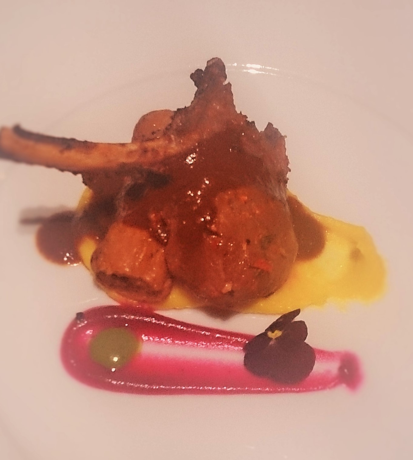 Première entrée : Saumon fumé au tandoor, daurade en croûte de semoule, chutney de saumon. Vin : Dolcetto d’Alba Coste e Fossati 2010. Le saumon est arrivé sous cloche. Une fois la cloche levée, de délicieux arômes de fumé se sont répandus. Il était délectable, à tel point que même mon cher et tendre, qui n’aime pas le saumon (que voulez-vous, il ne peut pas avoir que des qualités, cet homme-là !) l’a apprécié. La daurade était une sorte de beignet en forme de cigare, la semoule formant une croûte autour. Le chutney de saumon était ce que j’aurais appelé une rillette, délicate et moelleuse. Bref, un plat magistral. Le Dolcetto était à l’avenant : je suis habituée à des Dolcetto légers, celui-ci provenait de vieilles vignes et avait beaucoup de corps, un délice. De plus, il s’harmonisait étonnamment bien avec le saumon, une surprise pour moi qui ai plutôt l’habitude de servir du blanc avec le saumon.