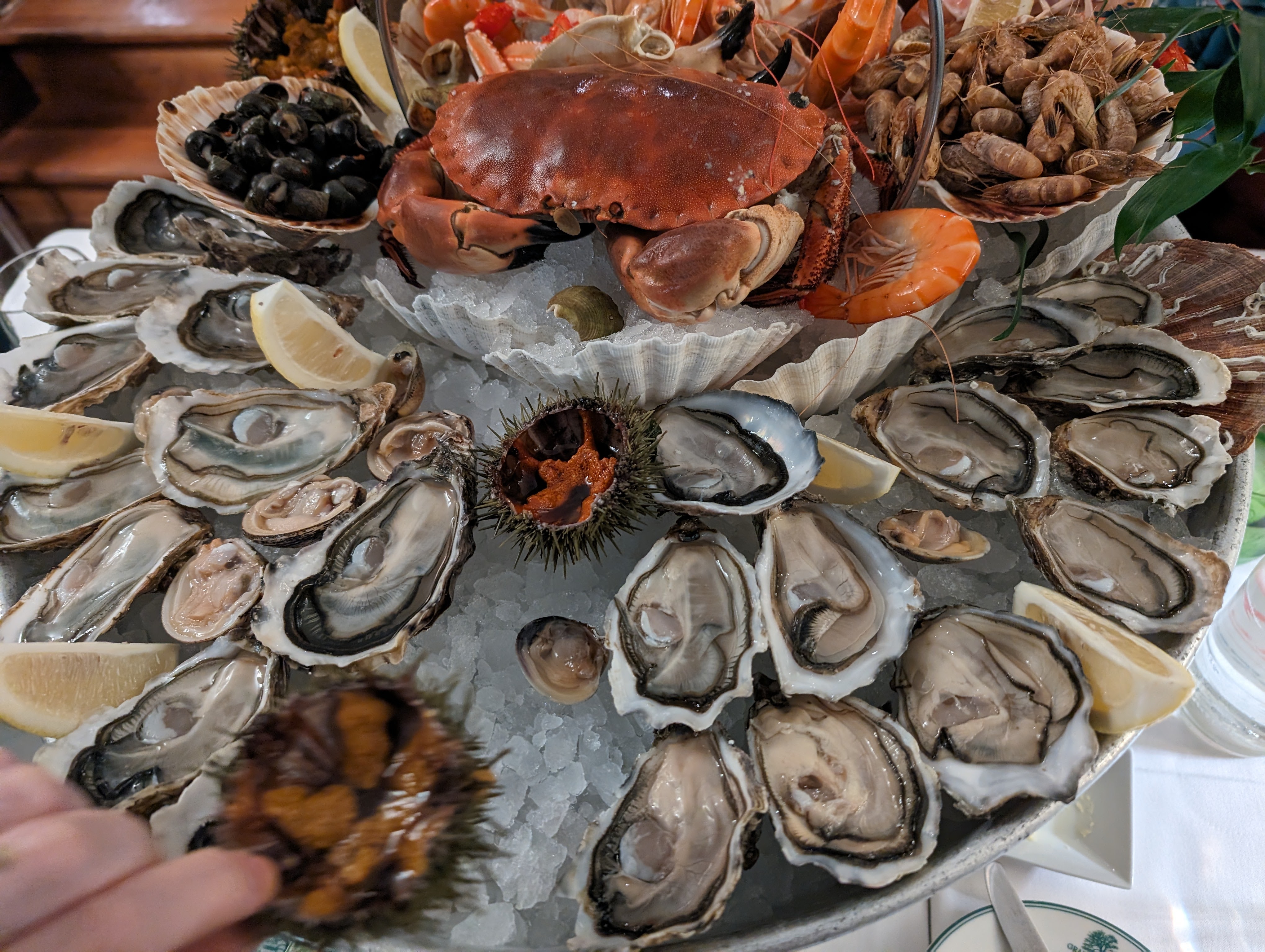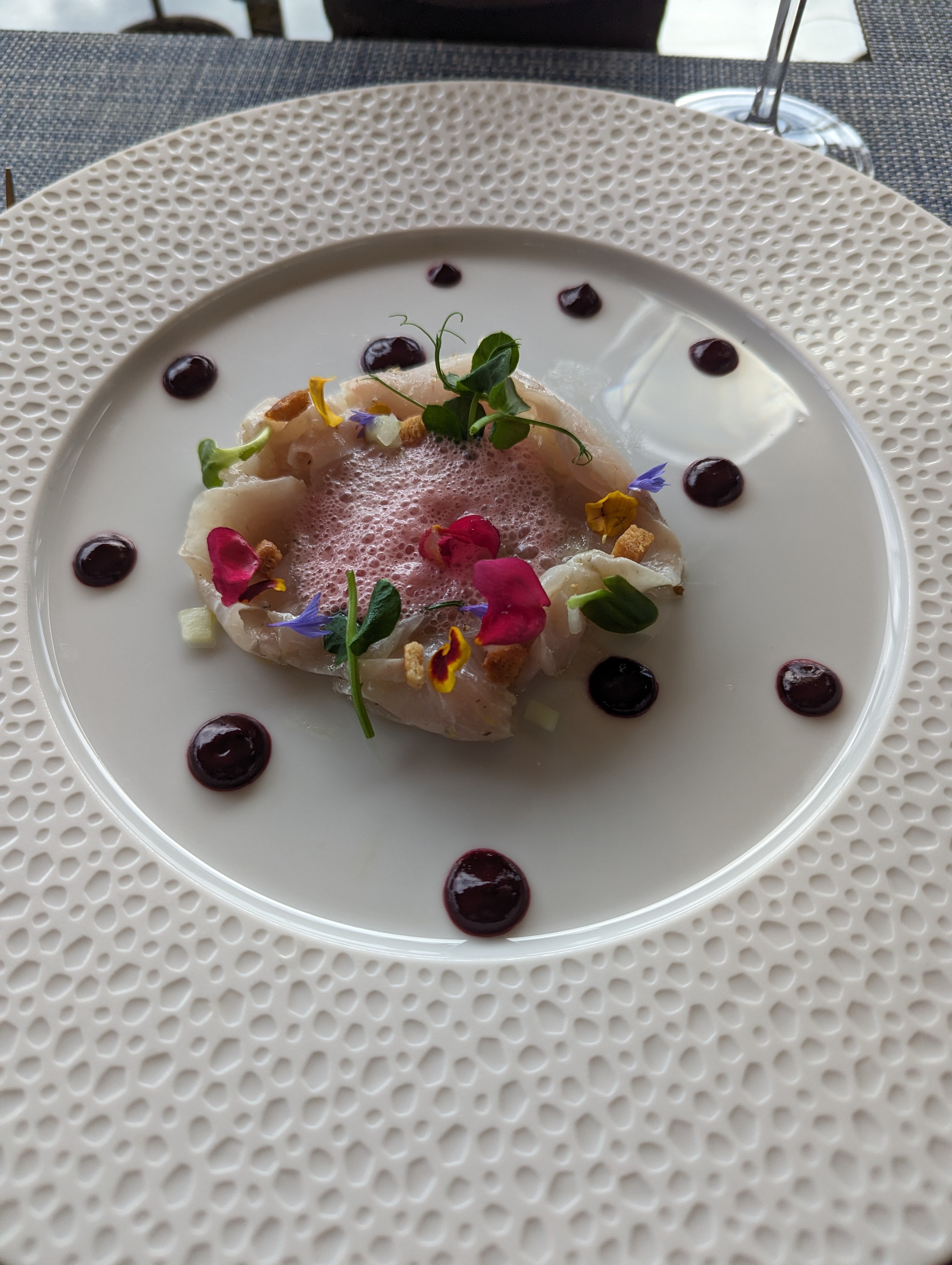Nous avons débuté avec des noix de saint-jacques (bien cachées par une jolie et savoureuse tuile sur la photo) dont la sauce était à damner un saint, puis une raie à la grenobloise, suivie par du veau en croûte à l’artichaut et par un baba « façon mojito ». Ce qui m’a frappée, c’est que les goûts étaient à la fois subtils et affirmés, aucune fadeur (par exemple, souvent les très jolies tuiles qui décorent un plat n’ont que très peu de goût, or celle-là était très savoureuse), un parfait équilibre, bref, chapeau bas !