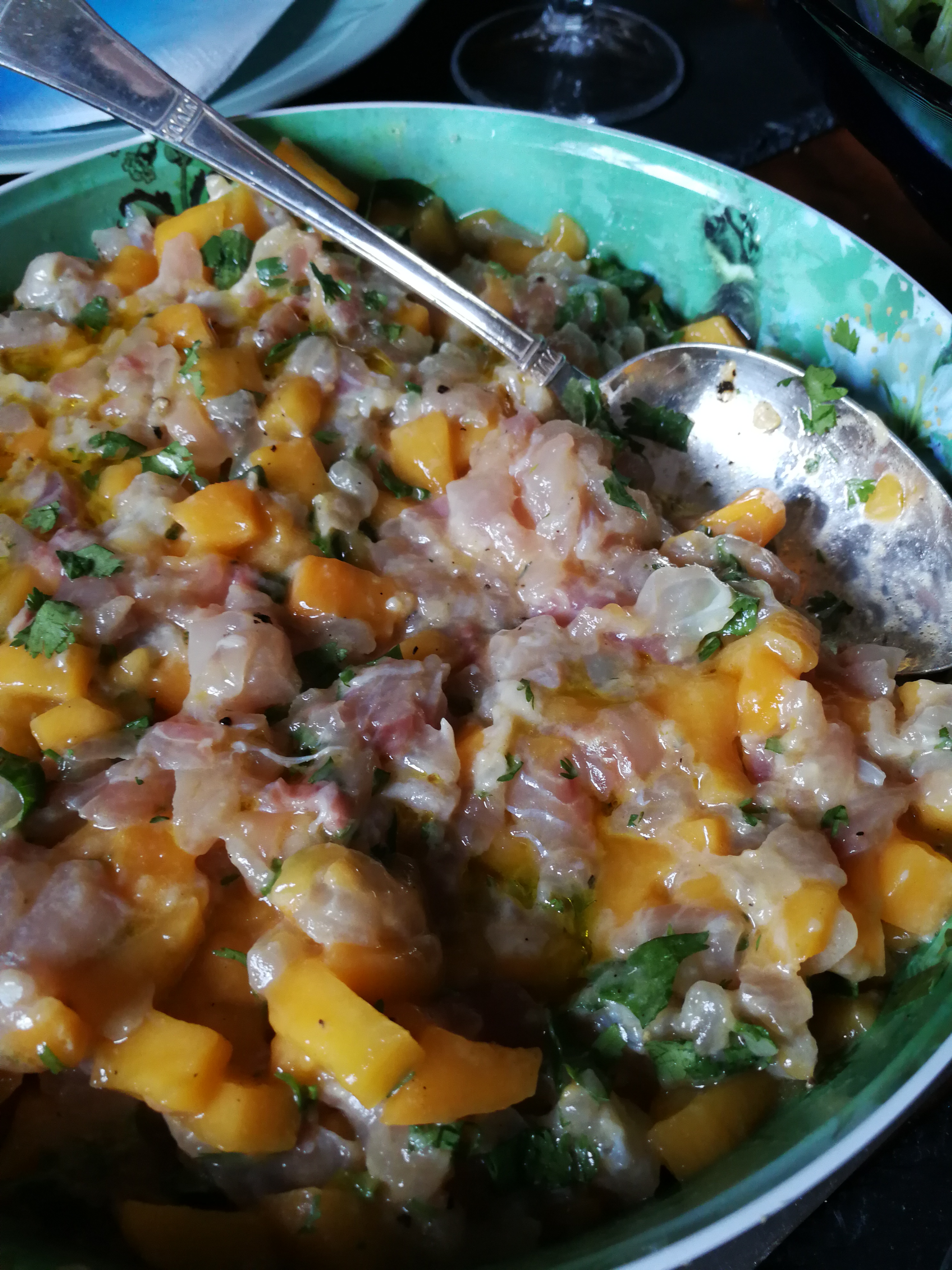 Vendredi soir, j’ai fait un tartare de daurade à la nectarine et à l’avocat, avec une salade de pousses d’épinards.