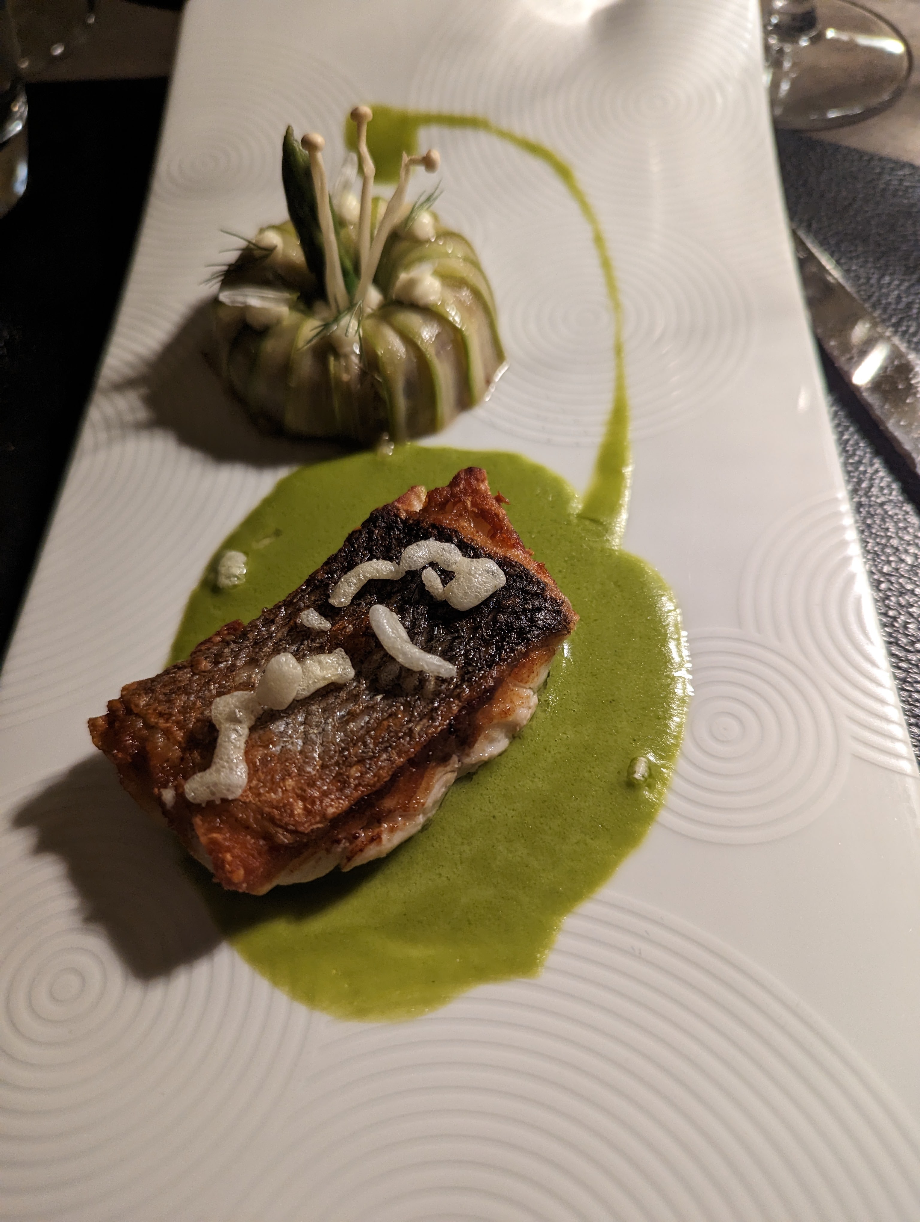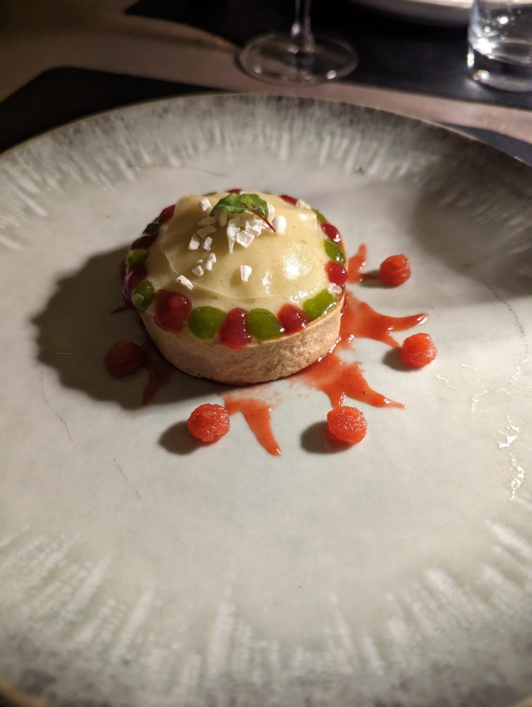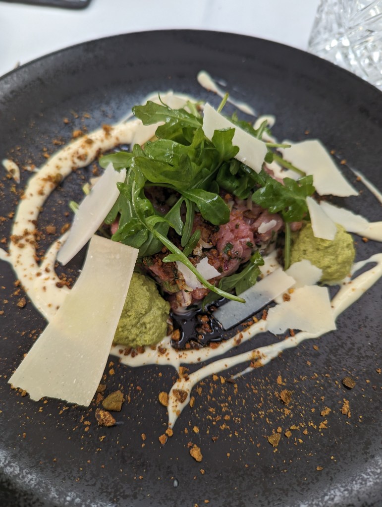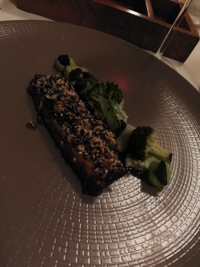 En entrée, j’ai choisi un « crudo de maigre de Méditerranée au concombre, coulis myrtille et écume de framboises » frais et délicat, et en plat j’ai demandé (et on m’a accordé sans l’ombre d’un problème) de pouvoir déguster une entrée en grande portion, à savoir le « bœuf suisse mariné aux herbes de l’arc alpin, cacahuètes torréfiées et oignons frits » un peu trop huilé mais néanmoins délectable. J’ai pris une jolie assiette de fromages pour terminer.