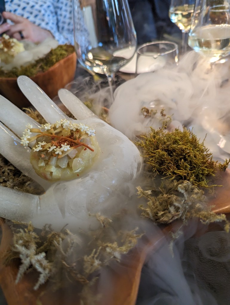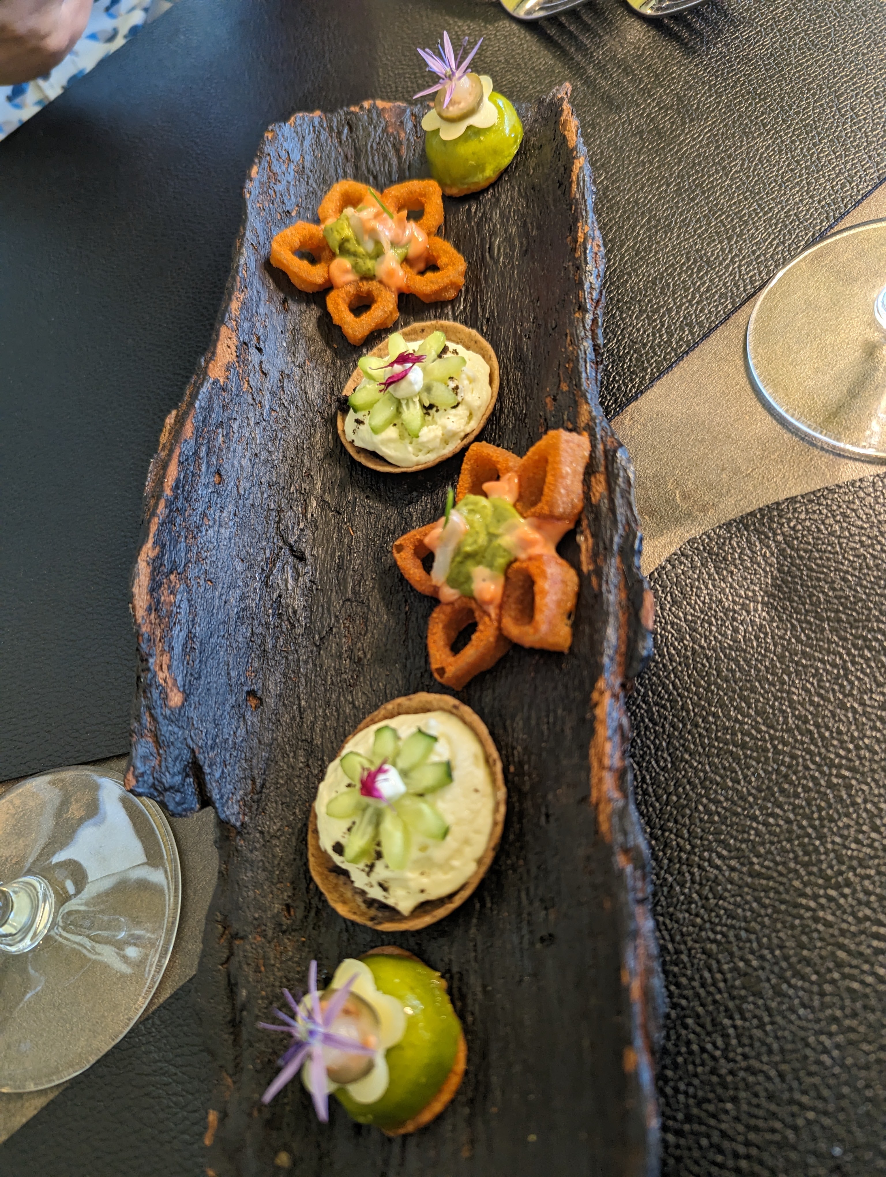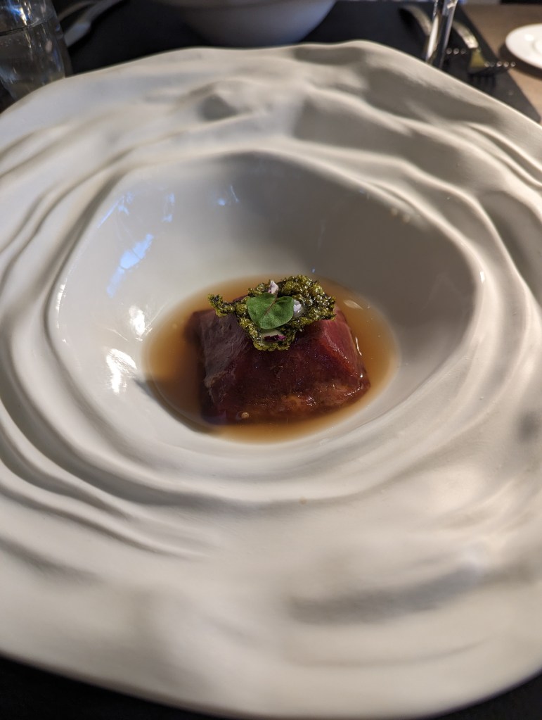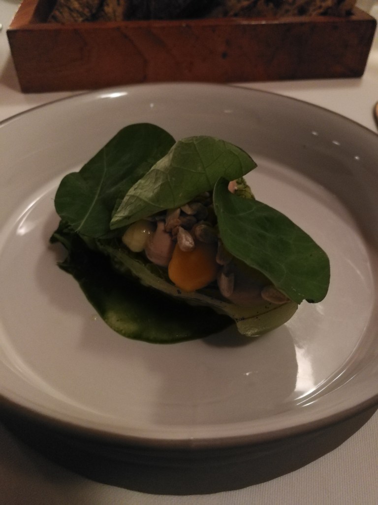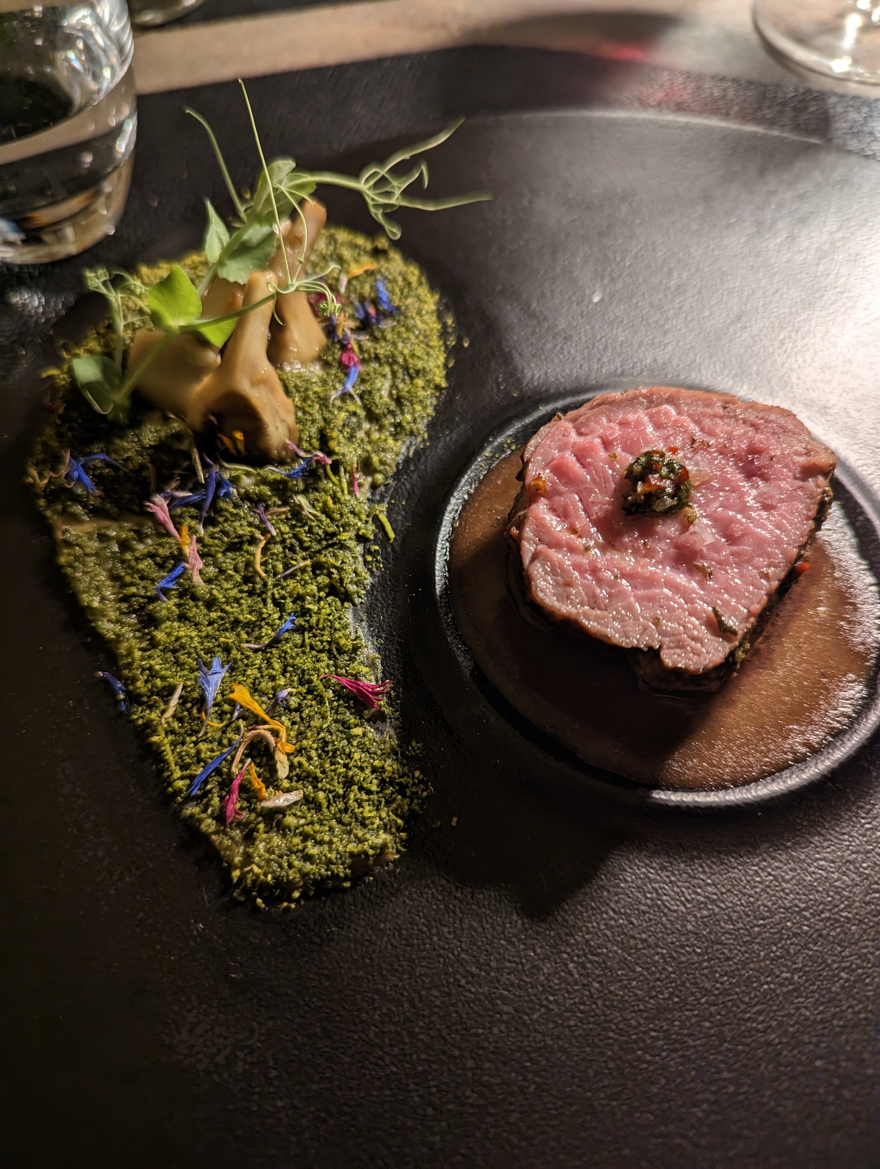 En entrée, j’ai choisi un « crudo de maigre de Méditerranée au concombre, coulis myrtille et écume de framboises » frais et délicat, et en plat j’ai demandé (et on m’a accordé sans l’ombre d’un problème) de pouvoir déguster une entrée en grande portion, à savoir le « bœuf suisse mariné aux herbes de l’arc alpin, cacahuètes torréfiées et oignons frits » un peu trop huilé mais néanmoins délectable. J’ai pris une jolie assiette de fromages pour terminer.